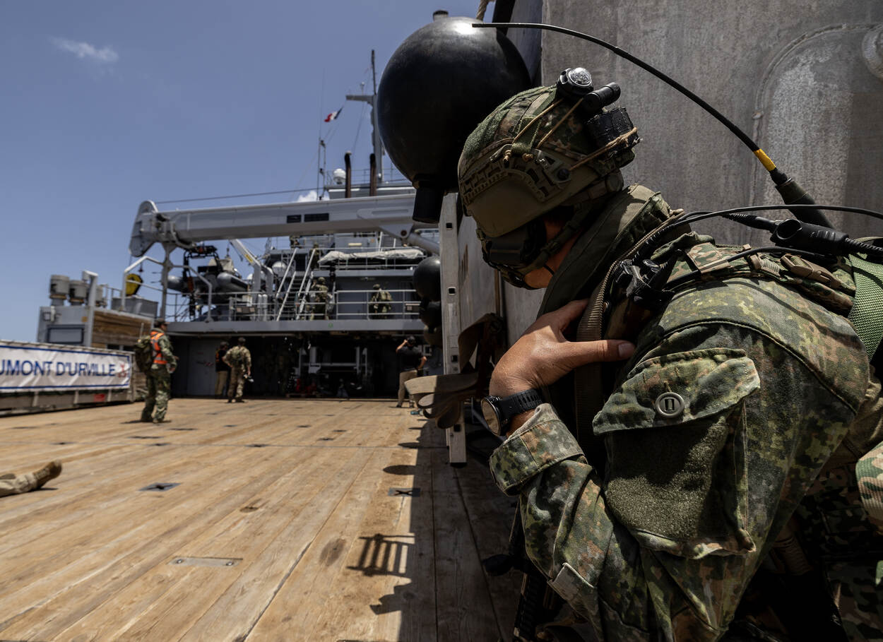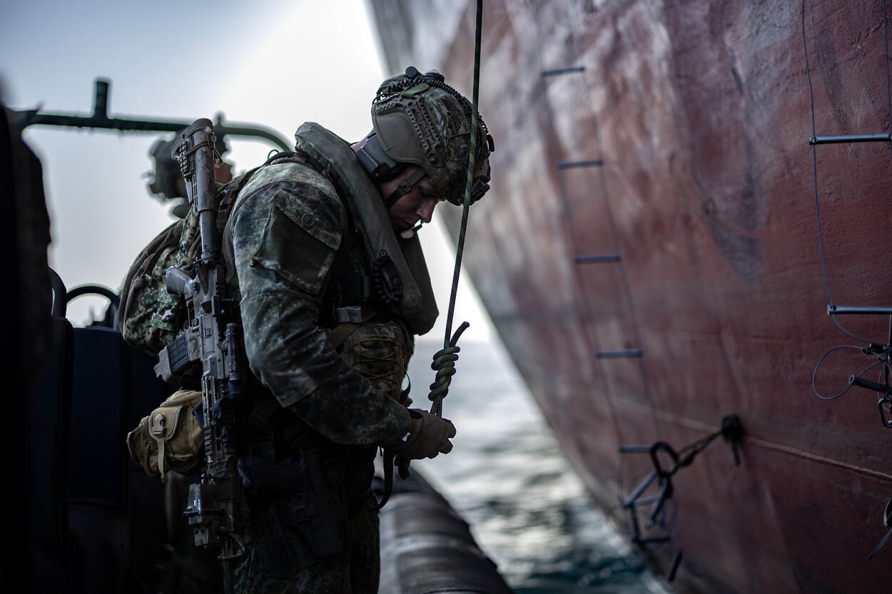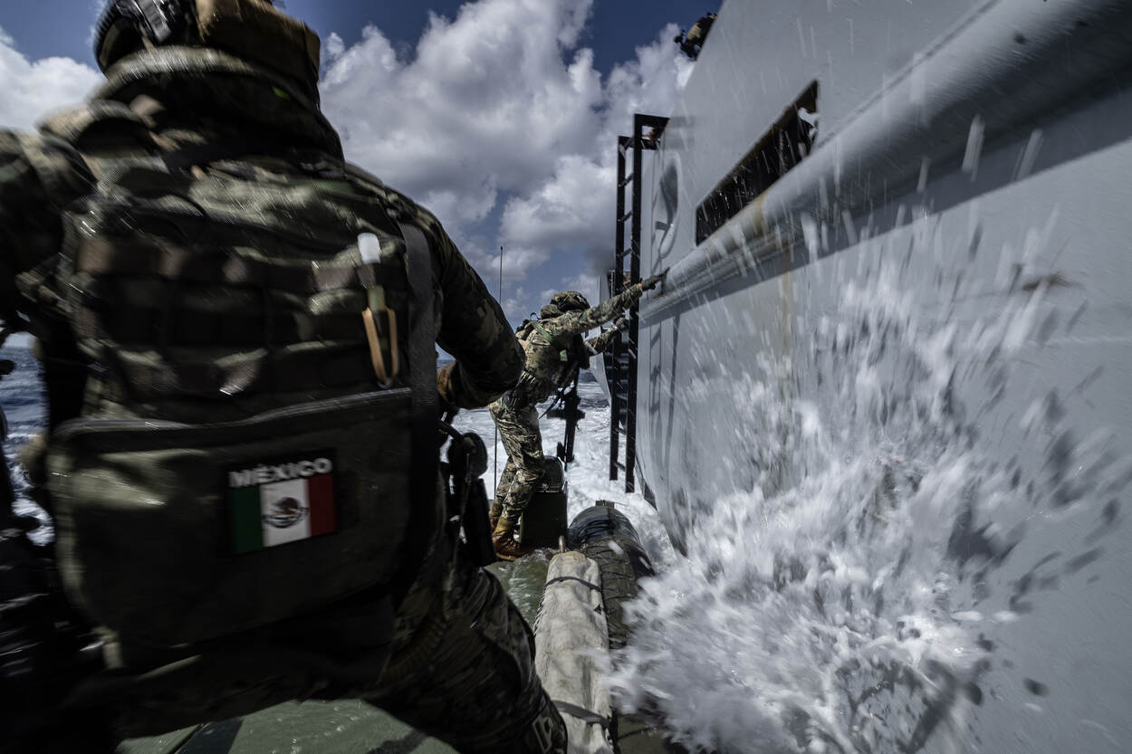 Op de Pelican Base van de Barbadiaanse kustwacht staan diverse tenten naast elkaar opgesteld. Hierin verblijven militairen van de deelnemende landen. In de brandende Caribische hitte biedt het tentdoek enige bescherming. Een paar meter verderop ligt een snelle boot van het type FRISC aan de kade, klaar om in actie te komen. Een tiental militairen stapt in, gewapend en veelal voorzien van gezichtsmasker. Slechts de vlaggetjes op hun uniform geven iets van herkenbaarheid weg: de Dominicaanse Republiek. Zij worden door Nederlandse mariniers van het Bootpeloton Curaçao en Aruba naar een verderop gelegen schip gebracht, om te enteren.