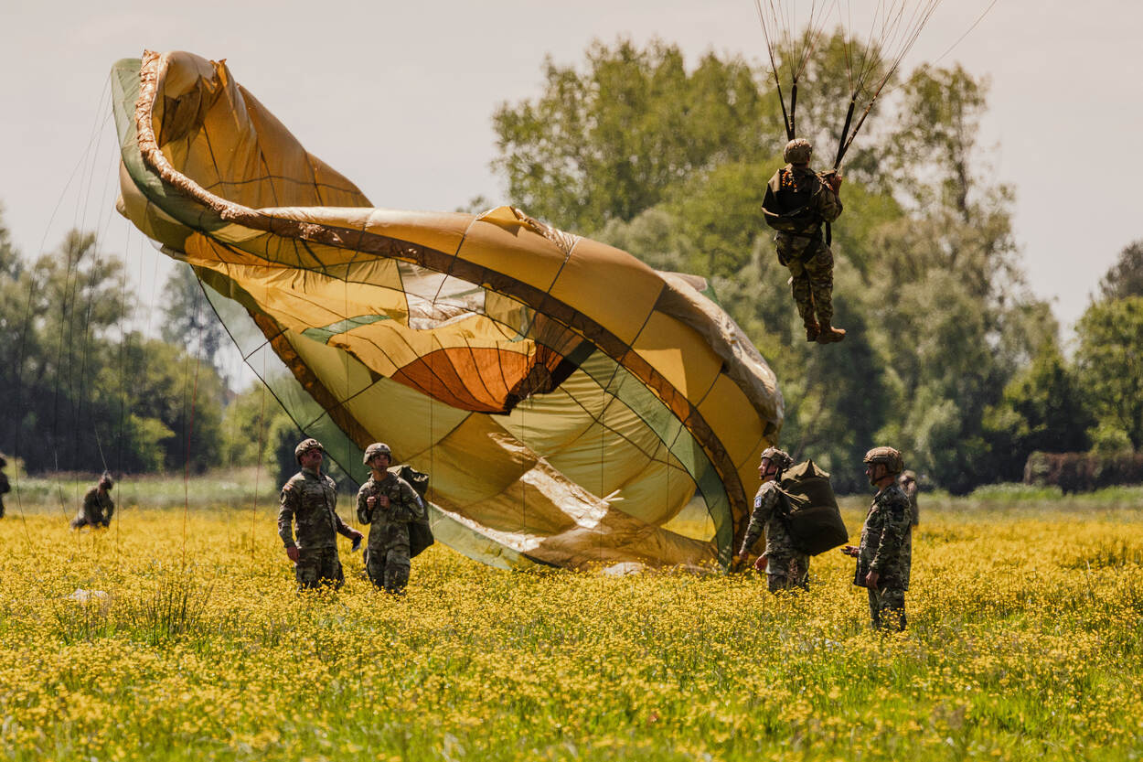 24 uur na het afronden van hun training heeft zich een menigte van vele duizenden toeschouwers verzameld rondom de dropzone bij Sainte-Mère-Eglise. Ze zijn daar zojuist getuige geweest van een groep ‘historische springers’, uitgedost in Tweede Wereldoorlog-uniformen, met logo’s van de destijds springende Amerikaanse 101st Airborne Division, als de speaker omroept dat de volgende wave arriveert. “ De C-130’s zijn al in de lucht”, kondigt hij aan.