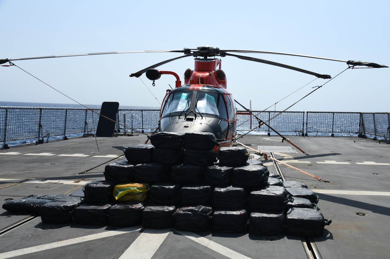 Een helikopter staat op het helidek van Zr.Ms. Groningen. Op de voorgrond ligt de grote drugsvangst.