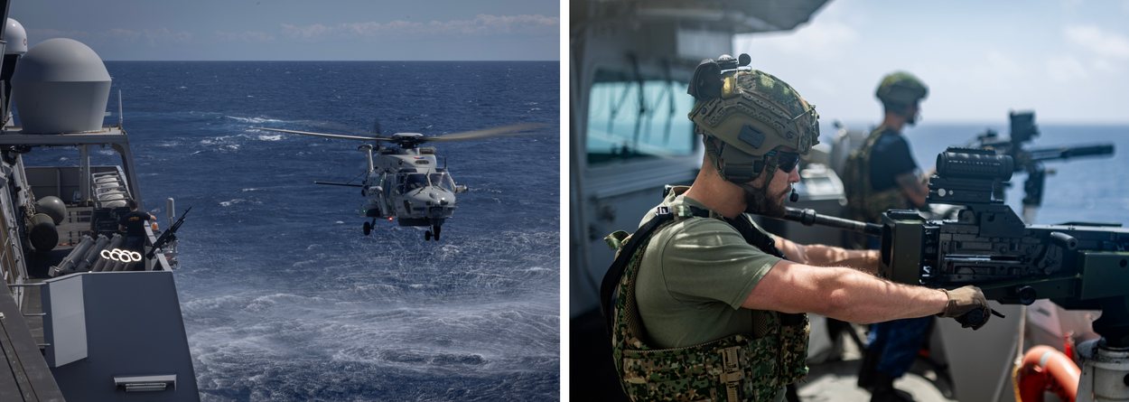 Ook in de Zuid- én Oost-Chinese Zee beleefde de Tromp spannende momenten. In het laatste zeegebied voerde het fregat patrouilles uit ter ondersteuning van een multinationaal VN-verband. Dat ziet toe op handhaving van de maritieme sancties tegen Noord-Korea. Chinese gevechtsvliegtuigen omcirkelden het schip meerdere keren. Ook benaderden ze de NH90-maritieme gevechtshelikopter tijdens een patrouille. Van Beusekom: “Het zijn zeeën waar we weliswaar mogen varen, maar allerlei omliggende landen claimen rechten die niet conform internationale afspraken zijn. Dit zijn de plekken waar het in de geopolitiek om draait.”
