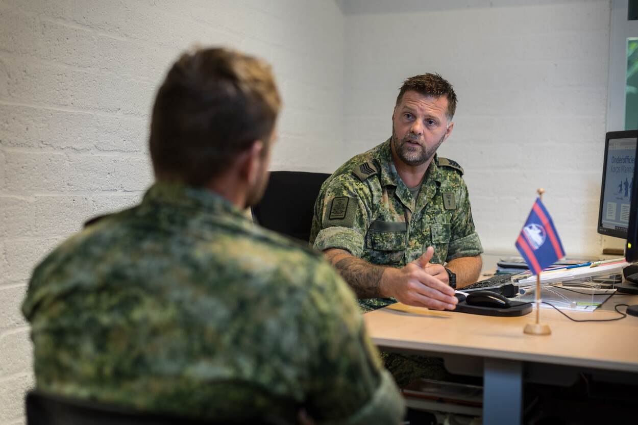 “De mannen komen binnen voor een bakkie koffie en aansluitend vragen we naar hun toekomst”, start de sergeant-majoor zijn betoog. “We praten bijvoorbeeld over een passende carrièremove bij de Korps Mariniers. Die gesprekken gaan over kansen, voorbereidingen, opleidingen en de werking van de modules. Uiteindelijk hebben ze dan de keuze uit 6 mogelijkheden: Infanterie, Support, Communicatie InformatieSystemen (CIS), Geneeskundige Dienst, Automonteur en Tamboers & Pijpers.”