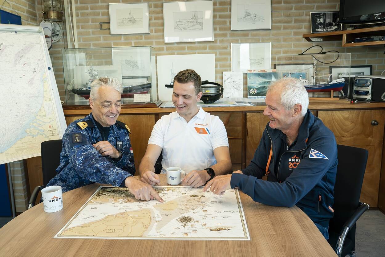 Luitenant ter zee 2OC Jeroen Lemmen, kustwachter Danyon Michalewski en de oud-Commandant Zeestrijdkrachten vice-admiraal b.d. Rob Kramer zijn 3 van een reeks vrijwilligers van KNRM-station Den Helder. “Maar we hebben in ons team ook een docent, een timmerman en nog meer vrijwilligers van buiten Defensie”, wijst Michalewki op de diversiteit in het team. Hij is opstapper bij de KNRM. Hij staat onder meer op het dek, maar kan indien nodig ook overstappen op een incidentschip, het schip in nood. In het dagelijkse leven is hij watch officer bij de Kustwacht. “Het komt dus voor dat ik beroepsmatig mijn eigen collega’s van de reddingsmaatschappij moet alarmeren”, toont hij een mooi dwarsverband.