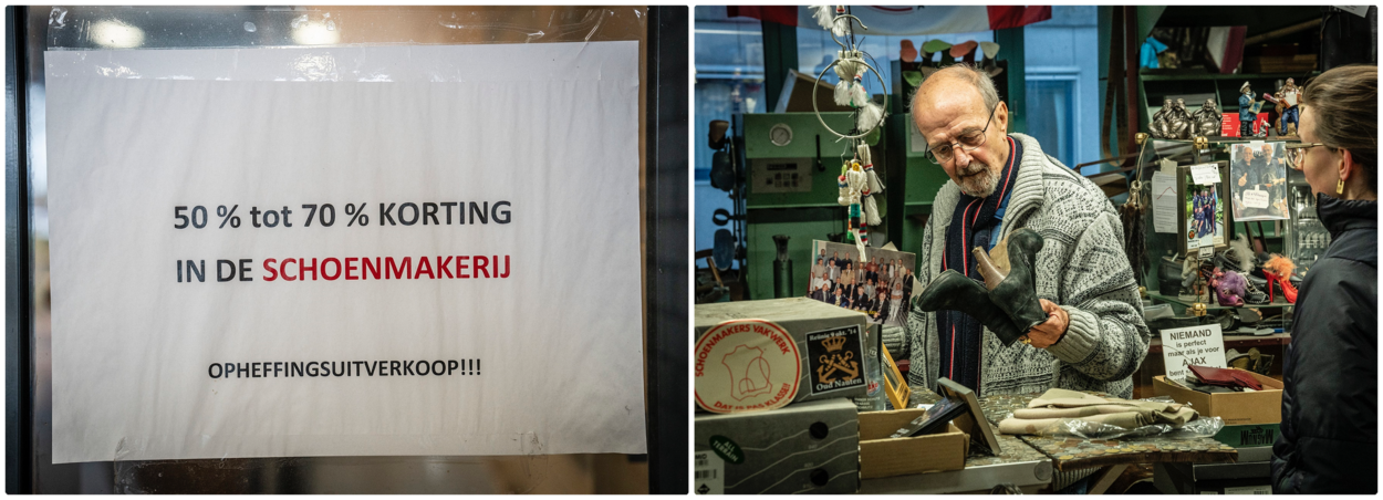 Tot 17 december, de dag voordat hij officieel afscheid neemt, is het uitverkoop in zijn stiel in de Witte Raaf, waar Rensen al sinds de opening in 1990 zit. Zijn aanstaande vertrek heeft nog niet iedereen meegekregen. Zoals luitenant ter zee 1 (AR) Jacoline, wier hak van een schoen reparatie behoeft. “O, gaat-ie weg? Ik wist pas net dat hier een schoenmaker zit”, merkt ze verrast op.