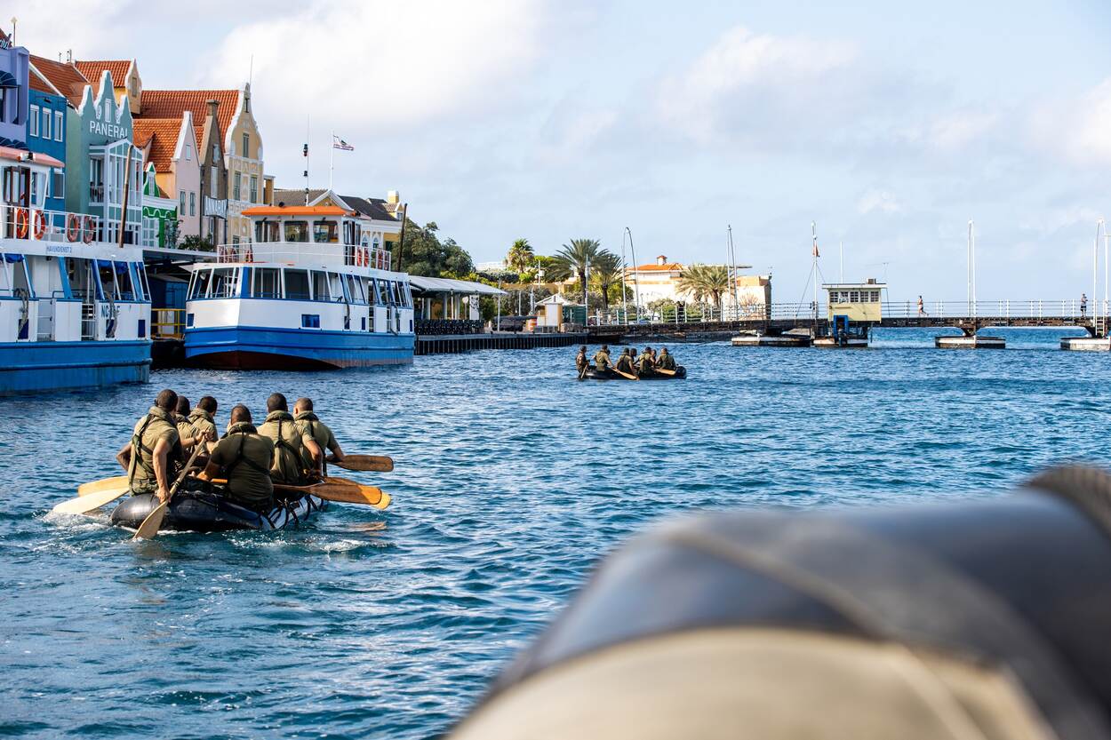 EMV’ers die met rubberboten de kade van Willemstad voorbij peddelen.