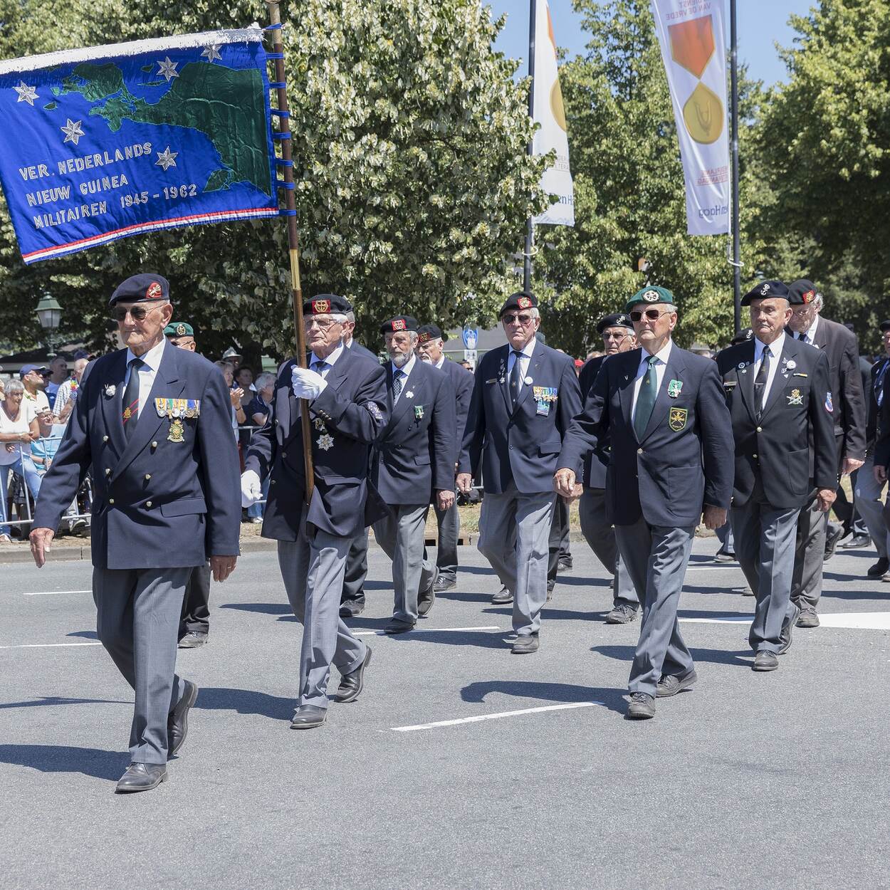 Marcherende veteranen met vaandel.