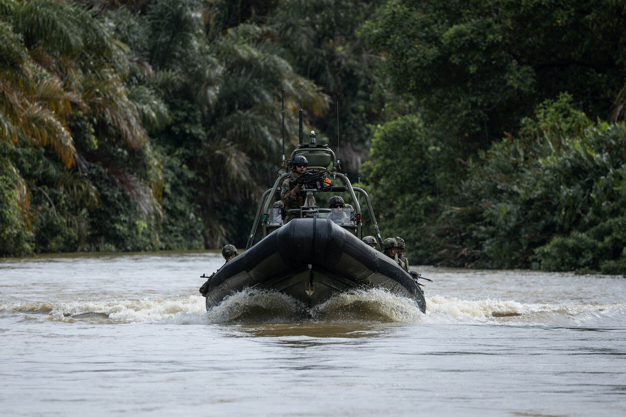 In de verte cirkelt een roofvogel boven het bladerdek van de jungle. Op de thermiek draait hij zo te zien moeiteloos rondjes boven de groene ‘plantenzee’. Iets daarbeneden heeft de aandacht getrokken. Het is ook precies de plek waar tot de tanden bewapende mariniers in 4 bootjes hun vizier op hebben gericht. De hele nacht hebben zij 3 kampementjes in de gaten gehouden. Nu is de tijd rijp voor de aanval. Terwijl vanaf een Nederlandse FRISC en een Colombiaanse Piranha dekkingsvuur wordt gegeven, stijgen mariniers verderop uit en trekken zij de jungle in om de vijandelijke kampen uit te schakelen.