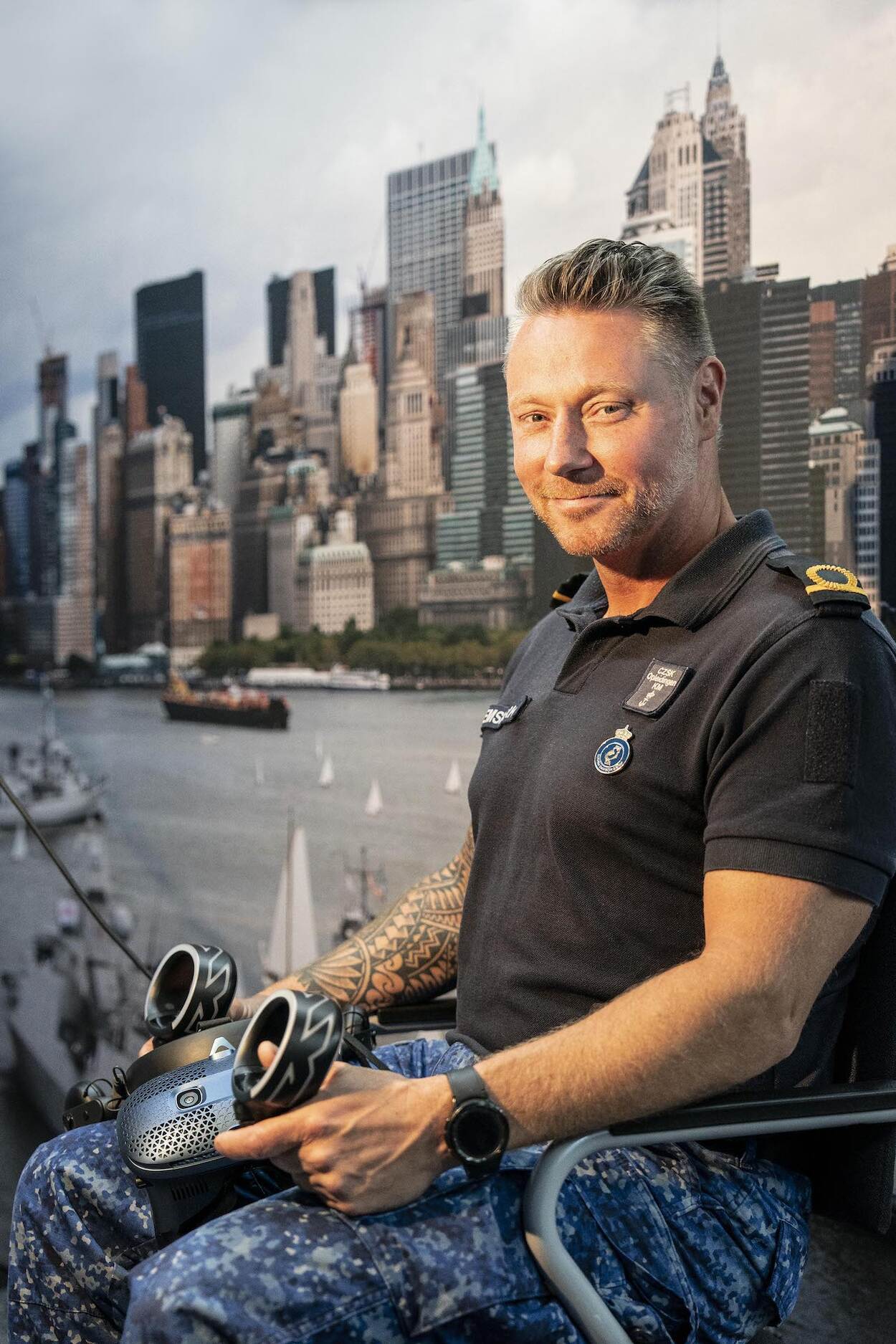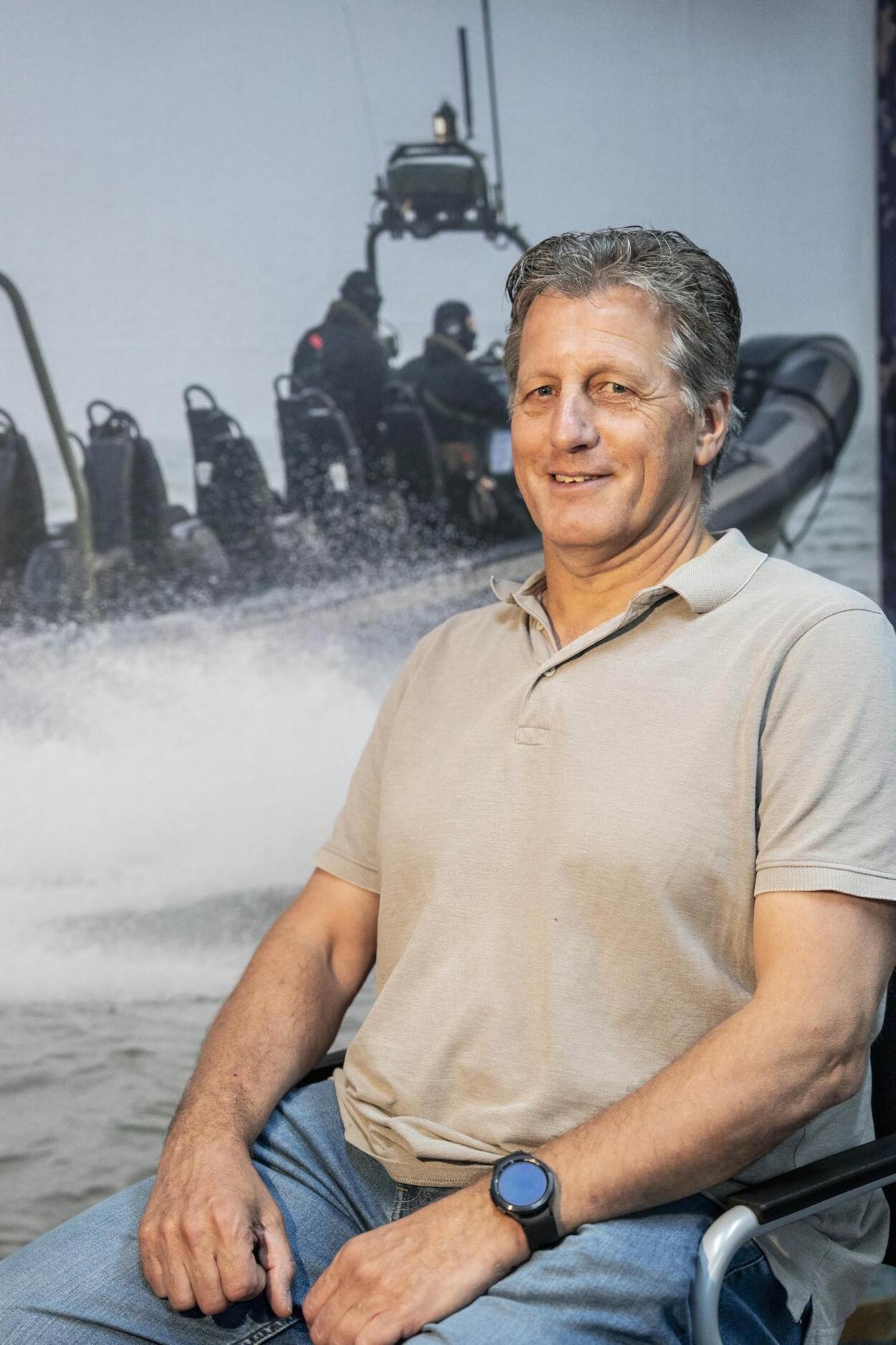 De ruimte is helemaal in marinesferen ingericht. Grote foto’s met een fregat tijdens een zonsondergang, een torpedowerkplaats, een havenbezoek aan New York. Zelfs het behang is perfect: het blauwe NFP-vlekkenpatroon van de nieuwe boordtenues. Het draagt sowieso bij aan de juiste mindset.