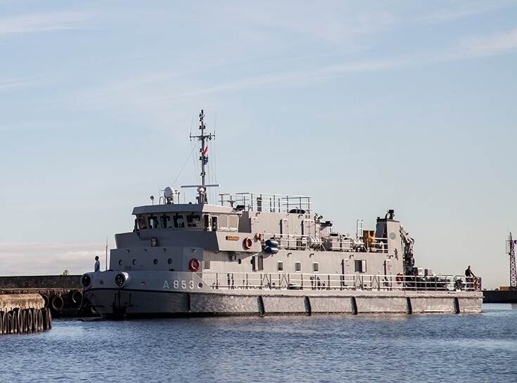 “Wij lagen als enige schip niet op zee, maar aan een kade in Scheveningen in een met hekken afgezet gebied. Onze rol was logistieke ondersteuning bieden voor de duikteams die pre bomb checks moesten uitvoeren, op verschillende locaties in Den Haag en Rotterdam. Wij fungeerden verder als een soort DHL Service Point voor de eenheden op zee. Materiaal, onderdelen en eventueel voeding werden bij ons afgeleverd en vervolgens per RHIB door deze eenheden bij ons opgehaald. Of we brachten het zelf naar de schepen. Zo konden de schepen doorgaan met hun primaire taak.”