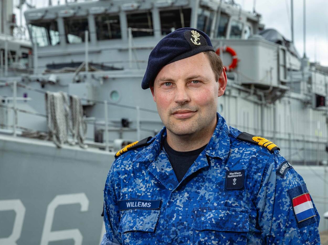Luitenant ter zee 1 Ludo Willems staand voor een uit dienst getelde mijnenjager in de haven van Den Helder.