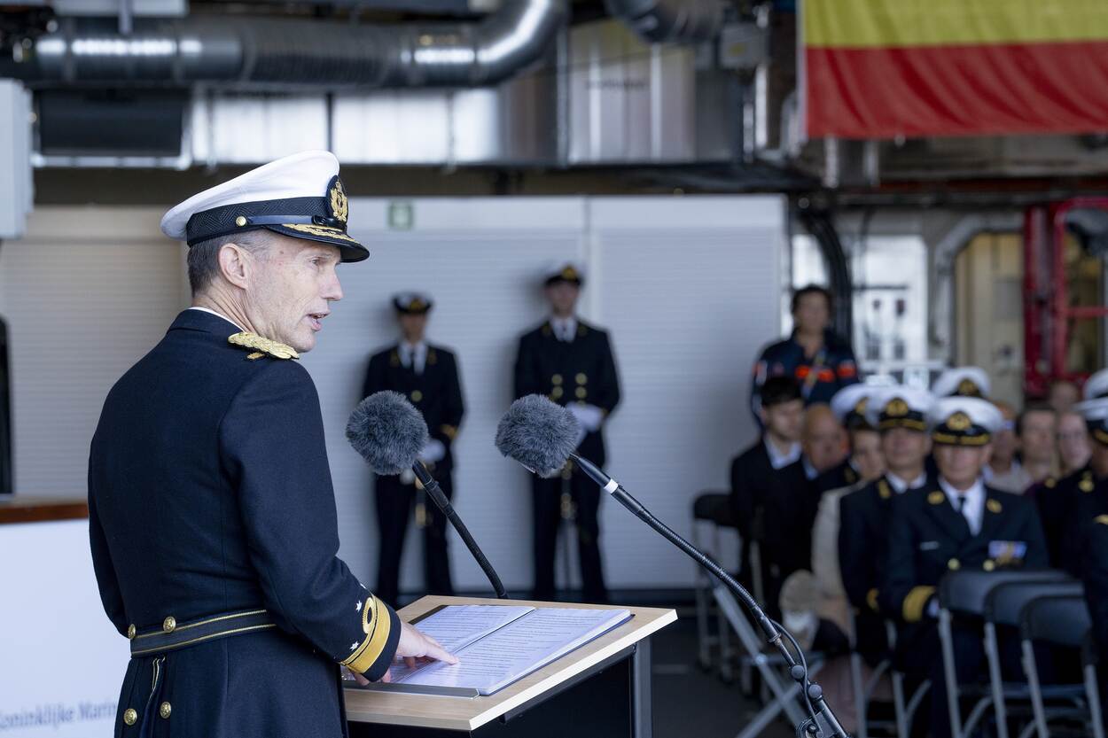 Vice-admiraal Liebregs spreekt genodigden toe aan boord van het nieuwe marineschip.