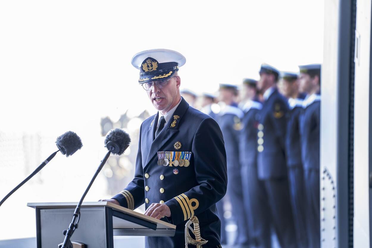 De commandant van het nieuwe marineschip achter het spreekgestoelte.