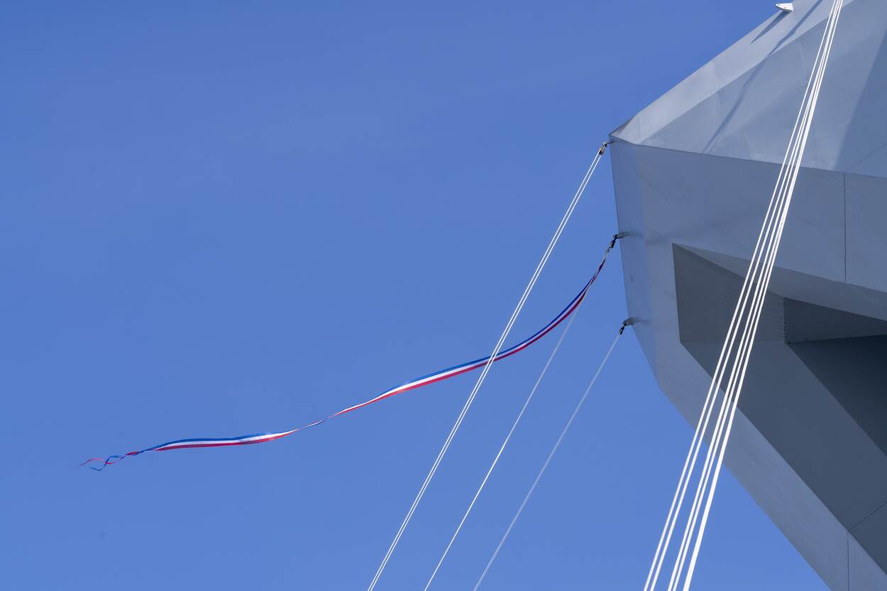 Links: het was ruim 10 jaar geleden dat de marine voor het laatst een nieuw schip in dienst stelde. Rechts: de indienststelling wordt muzikaal opgeluisterd.