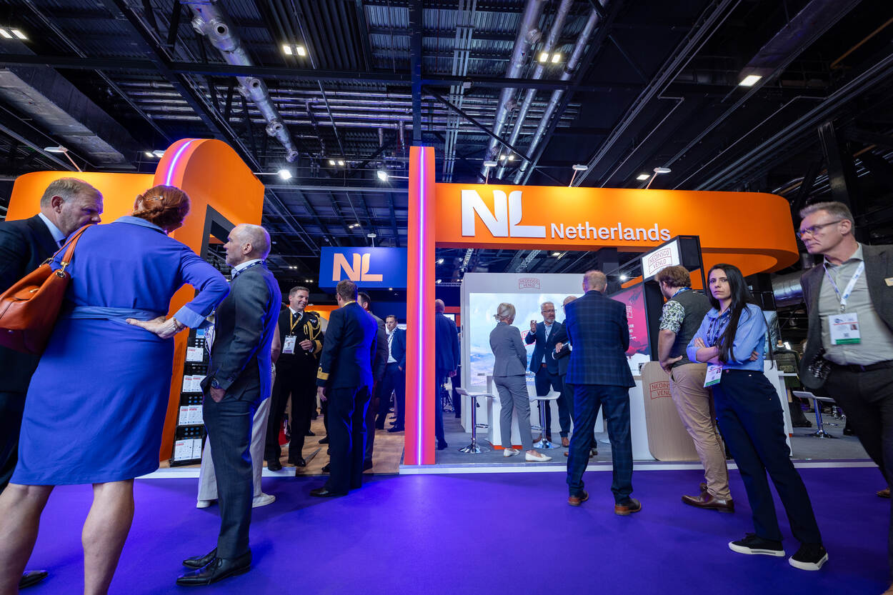 De druk bezochte Nederlandse beursstand. Mensen in zakelijke kleding staan te praten of lopen langs.
