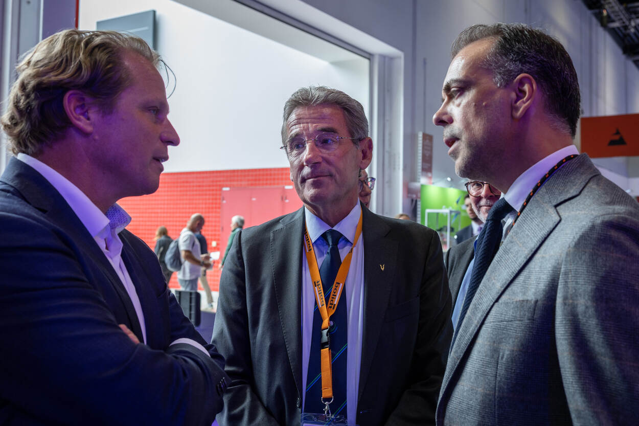 3 mannen in pak, staatssecretaris Tuinman en Huub Geilenkirchen (midden) en Robert van Aarle van Bolidt, spreken met elkaar.