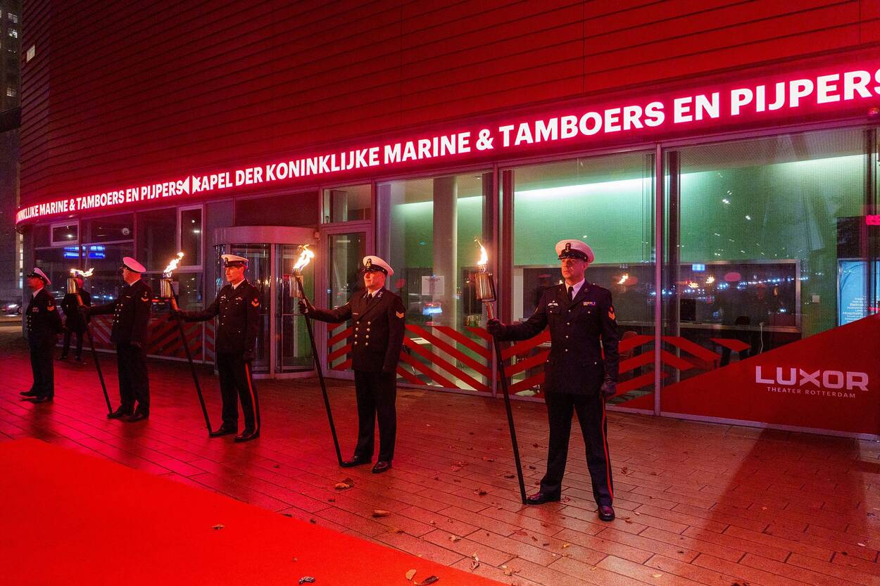 Mariniers met elk een fakkel staan voor de ingang van het Luxor theater in Rotterdam