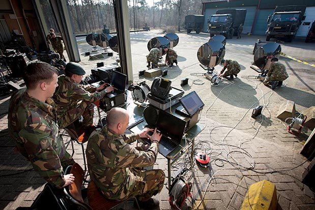 Communicatiespecialisten van de landmacht testen hun materieel.