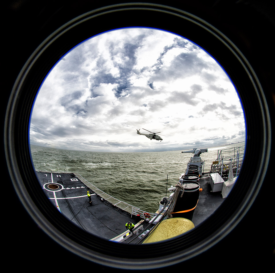 ‘Fisheye’ uitzicht op een NH90-helikopter op het vliegdek van Zr.Ms. Holland. Foto: John van Helvert