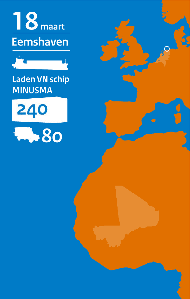 Achter Niessink is het lossen al begonnen. Majoor der mariniers Mark Baart, commandant van het havendetachement, kijkt tevreden toe. Samen met een klein team landmachters vloog hij in om het lossen in goede banen te leiden. “We willen alles zo vlug mogelijk in Mali hebben”, zegt Baart. Zo’n 80 voertuigen, waaronder terreinvoertuigen en pantserwagens van het type Bushmaster en Fennek en een slordige 240 containers met onder meer gevechtsrantsoenen, uitrustingsstukken en reserveonderdelen worden uitgeladen en op transport gezet.