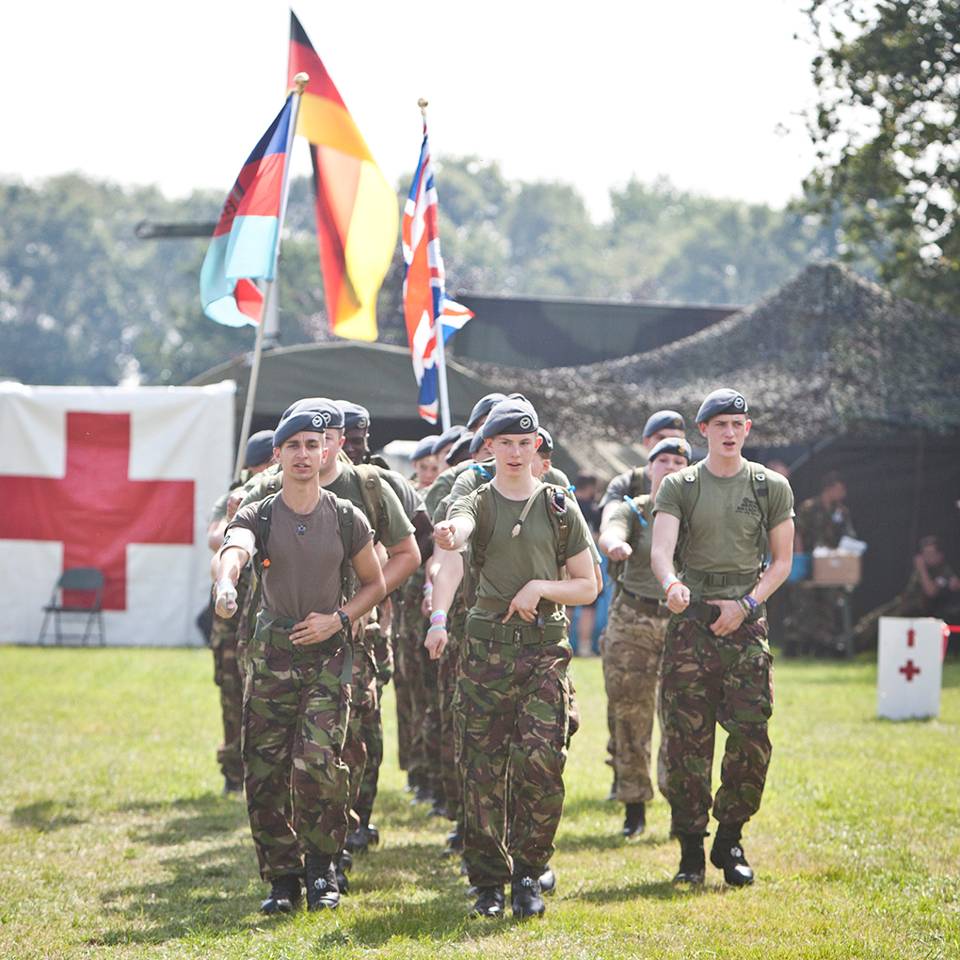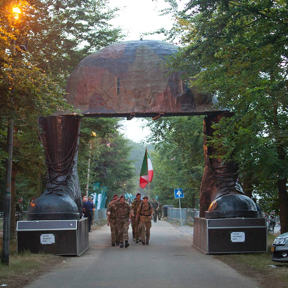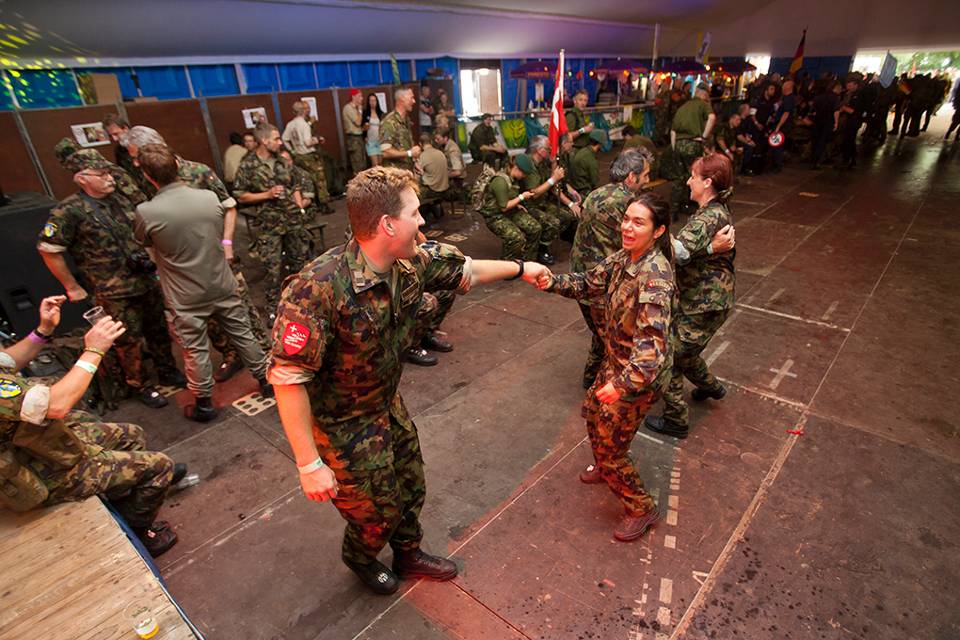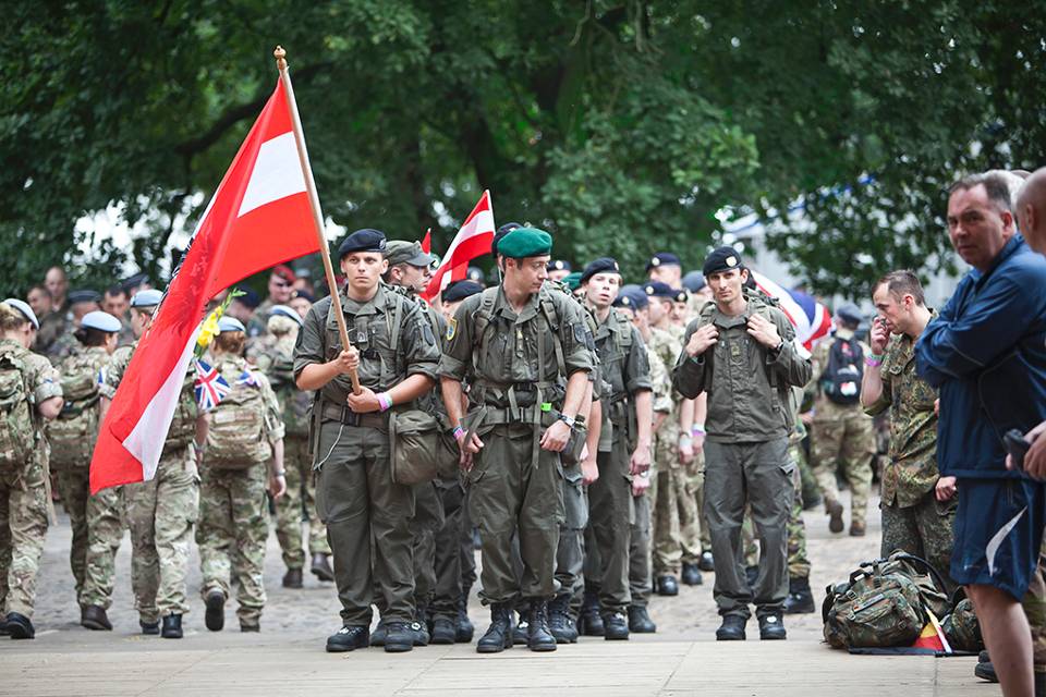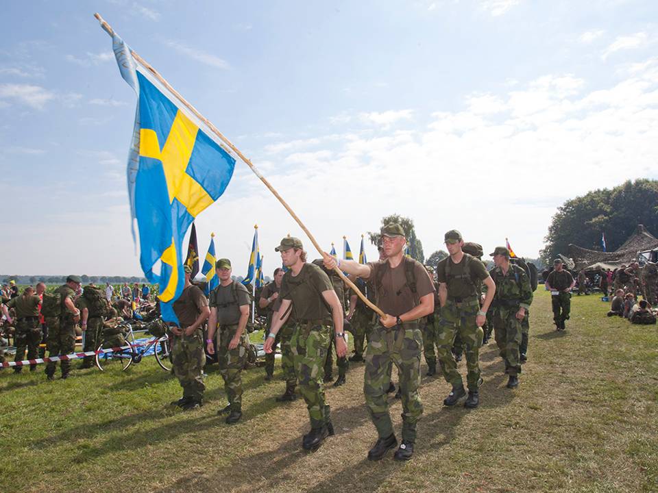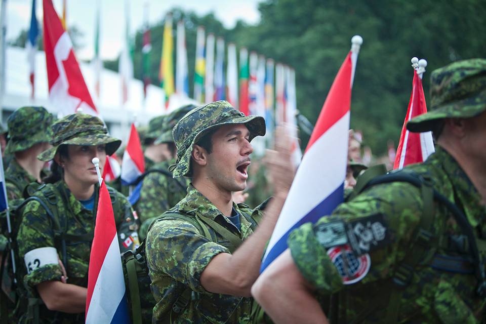Meer dan 5.000 militairen uit 31 landen begonnen aan de 98ste editie van de Nijmeegse Vierdaagse. Ze startten en finishten dagelijks op het door Defensie gebouwde Kamp Heumensoord in het bos tussen Nijmegen en Malden. In hun ‘thuistenue’ gaven de marsende militairen de Vierdaagse ook dit jaar weer extra kleur. Met hun eigen vlag trots op kop.