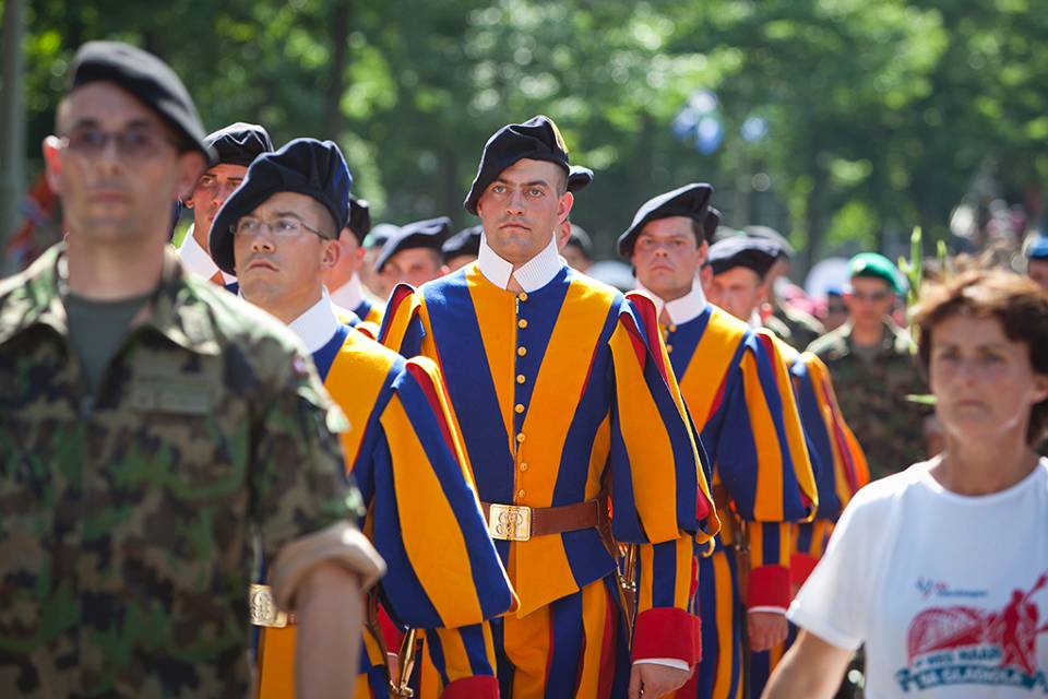 Een kleurige verschijning op Via Gladiola: de Pauselijke Zwitserse Garde voltooit de Vierdaagse.
