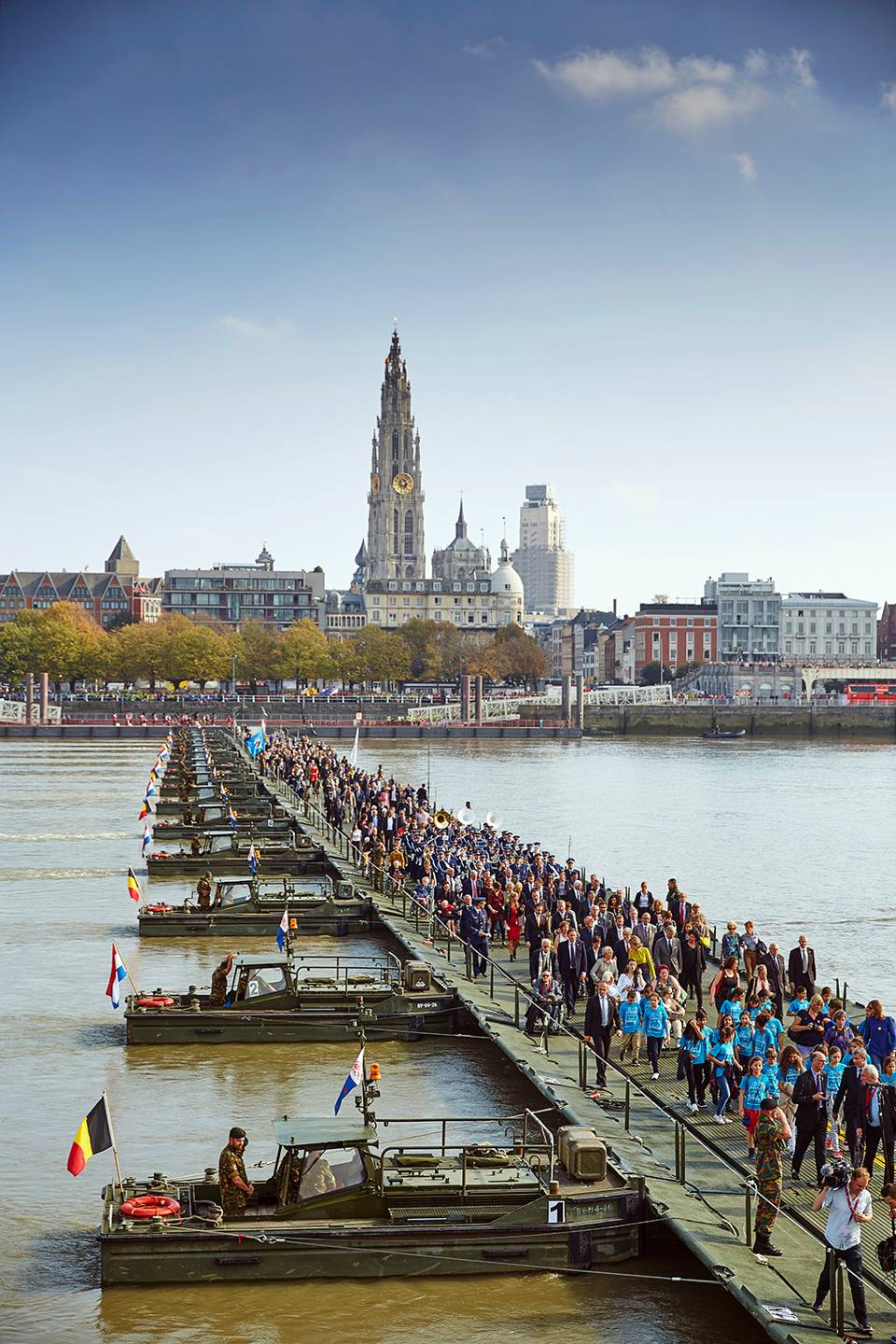 Voor de pontonniers betekent het dat ze nagenoeg alles uit de kast moeten trekken voor de brugslag over de Schelde. De Nederlanders brengen 49 pontons en 16 duwboten mee. De Belgen zorgen voor een bruggenhoofd en een valreep. Ook roepen ze de hulp in van de Brabo-kraan: de grootste vlottende kraan van de Antwerpse haven. Herdenking of niet, het scheepvaartverkeer op de Schelde mag niet volledig worden geblokkeerd. Daarom varen de duwboten een aantal keer per dag de pontons weg. In grofweg 11 minuten kunnen de pontonniers opbreken. In 21 minuten zetten ze de brug weer in elkaar. Maar goed ook, want de Antwerpenaren stonden het hele weekeinde lang te trappelen om van Het Steen naar de linkeroever te lopen. Vooraf waren maar liefst 100.000 kaartjes verkocht voor een wandeling over de Schelde.