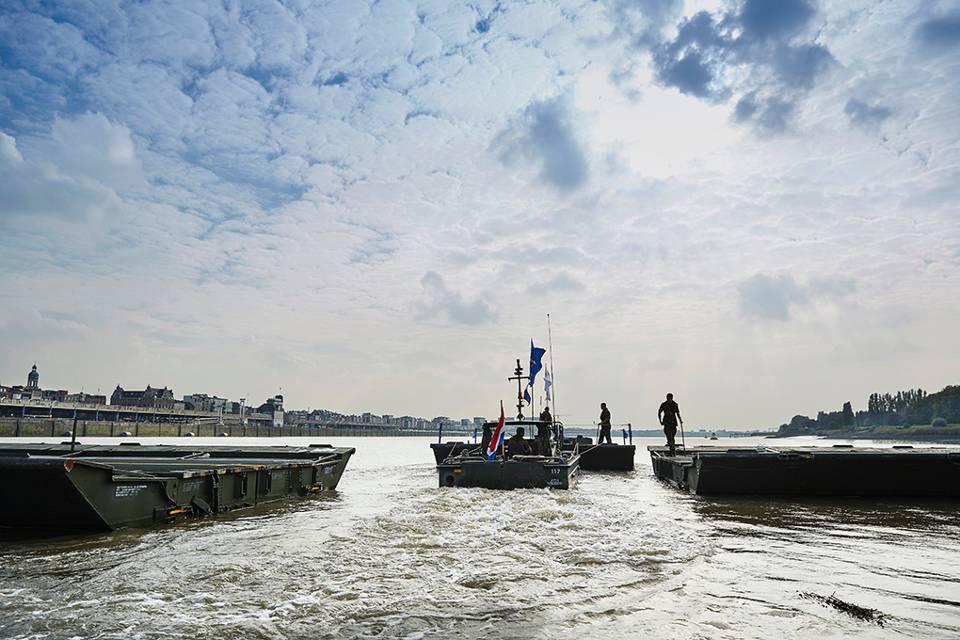 “Onze genisten hebben veel ervaring met pontonbruggen. Maar het werken op een getijdenrivier als de Schelde is echt even iets anders”, zegt kapitein Koen van Dinter , plaatsvervangend commandant 105 Geniecompagnie Waterbouw. “Het verschil tussen eb en vloed kan wel 6 meter zijn. Door dat getijdenverschil wisselt de stroming.”
