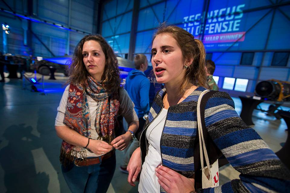 De infodag wordt ook door een redelijk aantal vrouwen bezocht. Onder hen de vriendinnen Marijke Pasnis (23) (links) en Tyrza Ligthart (23), beiden universitair bouwkundestudenten. Ligthart: “Ik ben bezig met mijn master building technology en wil nog even uitzoeken wat ik daar precies mee kan bij Defensie. Ik ben bang dat ik te schijterig ben om militair te worden, dus misschien zou ik voor een burgerfunctie gaan. Al maak je denk ik wel veel vette dingen mee op missie.”
