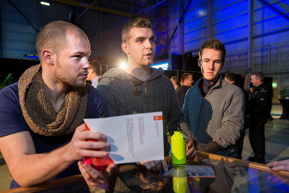 “We zoeken alle 3 een afstudeerplek”, vertelt Jelmer Peerbolte (24, links), student industrieel ontwerper aan de Technische Universiteit Delft. “Bij voorkeur bij een operationeel commando van Defensie. Ik heb een aantal militaire vrienden en die vertellen me vaak mooie verhalen over hun werk. Dat wil ik ook. En dan het liefst als militair in plaats van burger. Ik denk dat er onder militairen meer kameraadschap heerst.”