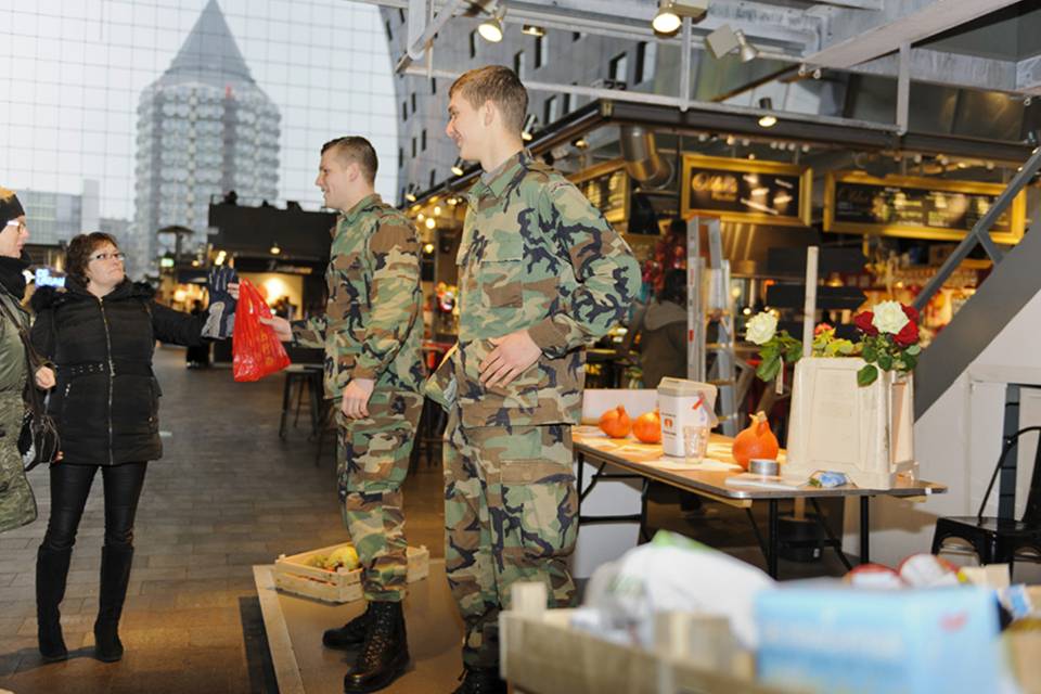 Pakken rijst, sauzen of macaroni. Zomaar wat producten die het winkelend publiek in de vorig jaar geopende Markthal bij de mariniers inleveren. Op 7 en 8 januari bemannen meer dan 40 militairen 12 winkels in Rotterdam. De mariniers, onder wie Niels en Bram, vragen het winkelend publiek bij binnenkomst iets extra’s te kopen en bij hen in te leveren voor het goede doel.