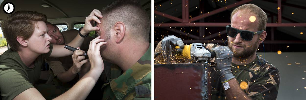 Luitenant Bram Baars (412 Pantsergeniecompagnie) instrueert zijn ploeg genisten over de laatste wijzigingen in het bestek. “De planning verandert hier continu, daar moeten we flexibel en creatief mee kunnen omgaan. Da’s trouwens ook een van onze doelstellingen”. Even later klinkt een oorverdovende heksenketel van klusgeluiden: ratelende boormachines, spetterende lasapparaten, kloppende hamers. Zij aan zij bikkelen Burundese en Nederlandse militairen tegen de deadline van oplevering. Hier wordt stevig aangepakt, da’s duidelijk.