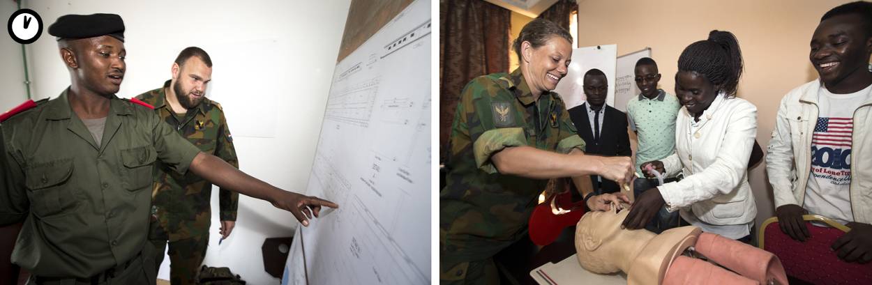 In een klaslokaal tonen algemeen militair verpleegkundigen sergeant Cindy Grooters en David Gerrits hoe zij een zuigende borstwond zouden behandelen. Daarna mogen de Burundese verpleegkundigen breed lachend oefenen op de meegebrachte pop.