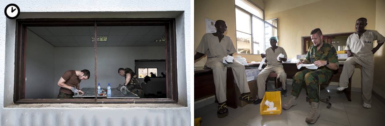 De geneeskundige militairen keren terug van hun lunchpauze in het hotel, de genisten eten hun lunchpakket op de werkvloer. “We hebben een strakke deadline, dus pakken liever door”, zegt sergeant Bart Koster (412 Pantsergenie). Vanmiddag zijn de plafonds en kabelgoten aan de beurt. “De uitdaging voor ons ligt in het werken met lokale middelen, we moeten ons aanpassen aan de spullen en gereedschappen van hier. Geloof me, een Chinees accutolletje loopt toch net even wat sneller warm en is eerder leeg dan het materiaal thuis. En het Burundese staal is gewoon bros, daar heeft onze lasser een beste uitdaging aan. Maar de samenwerking met de Burundezen loopt weer helemaal prima; zij leveren goed werk.”