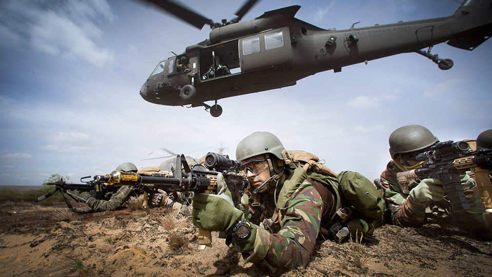 pantservoertuigen, infanteristen, helikopters, zware artillerie, special forces