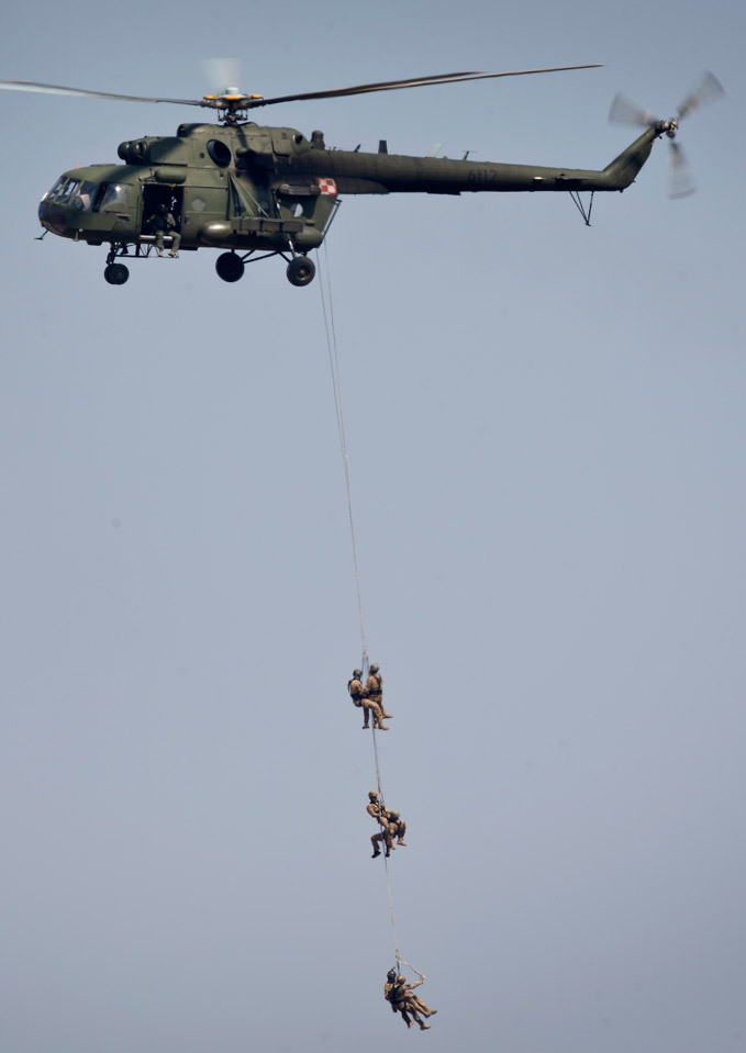 Zonder dat de heli hoeft te landen, worden Poolse 'special forces' razendsnel uit een gevaarlijk gebied gehaald.