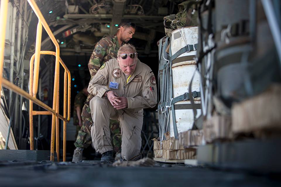 De ‘loadie’: Achterin de kist houdt een loadmaster de lading nauwlettend in de gaten. Een spanband en een speciale metalen goot houden de ‘stick’ – de reeks ladingen – op hun plek. Timing, daar draait het om bij een airdrop. In de laatste minuten voor de airdrop opent de loadmaster de laadklep. Pas als het groene licht aanspringt, snijdt hij de strakgespannen verankering aan. Door de spanning op de band scheurt die in 1 keer door.