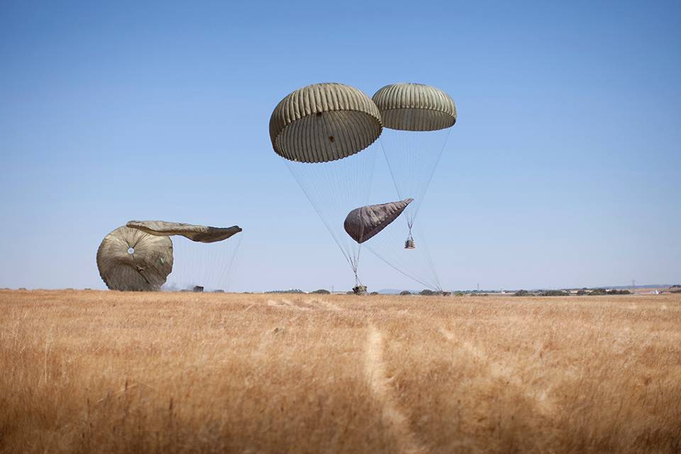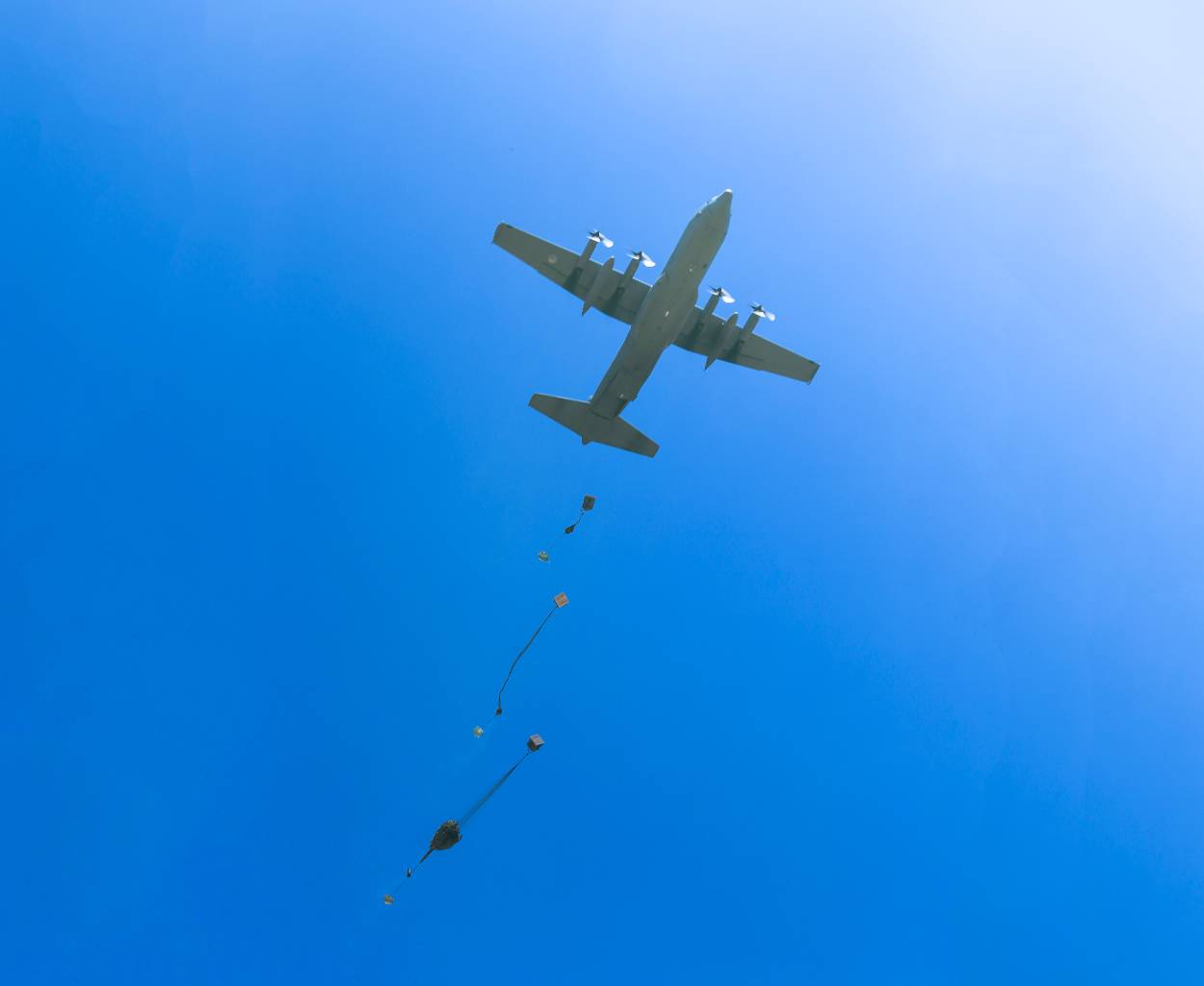 De lading: Eén voor één schuiven de ladingen uit het vrachtruim. De parachute aan de pakketten opent direct. Tijdens de training zette de Defensie Para School voor het eerst ook ‘slimme’ parachutes in. Deze vinden dankzij een gps-systeem en een computergestuurd valscherm vanaf grote hoogte zelfstandig hun weg naar het doel. Daar landen ze tot op 5 meter nauwkeurig. Ze zijn bedoeld voor de bevoorrading van speciale eenheden in vijandig gebied.
