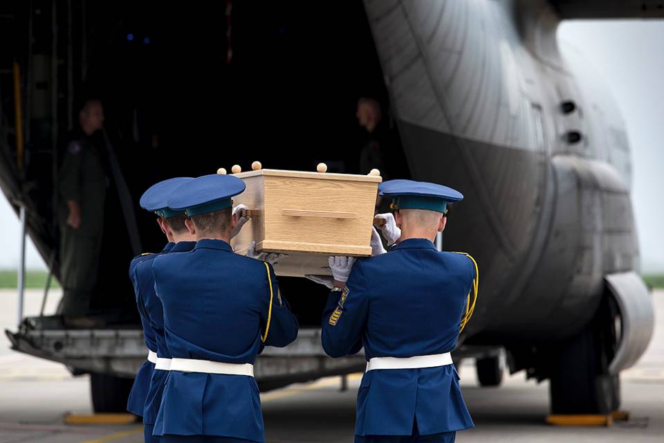 De eerste aanblik van de tientallen bodybags op een desolaat station in Charkov maakt diepe indruk op de overste. “Toen pas drong de werkelijkheid én omvang door. En dan heb ik toch al een hoop ellende op de wereld gezien. Deze missie voelde vanaf dag 1 persoonlijk. Voor alle teamleden. Iedereen kende wel iemand die bij de ramp betrokken was. De achtergronden of kleuren uniform deden er niet toe; iedereen had dezelfde focus.” Veel ruimte voor emoties is er niet. De terugkeer van de lichamen krijgt de allerhoogste prioriteit van het kabinet. Vanaf 23 juli zet Defensie daarom een ‘luchtbrug’ op tussen Charkov en Eindhoven. Een Australische C-17 en een Nederlandse C-130 Hercules transporteren de lichamen en persoonlijke bezittingen naar Nederland. In totaal volgen 10 vluchten. Allemaal met hetzelfde, waardige eerbetoon op vliegbasis Eindhoven. 2 mei arriveerde het vliegtuig met aan boord de laatste 7 kisten met stoffelijke resten.
