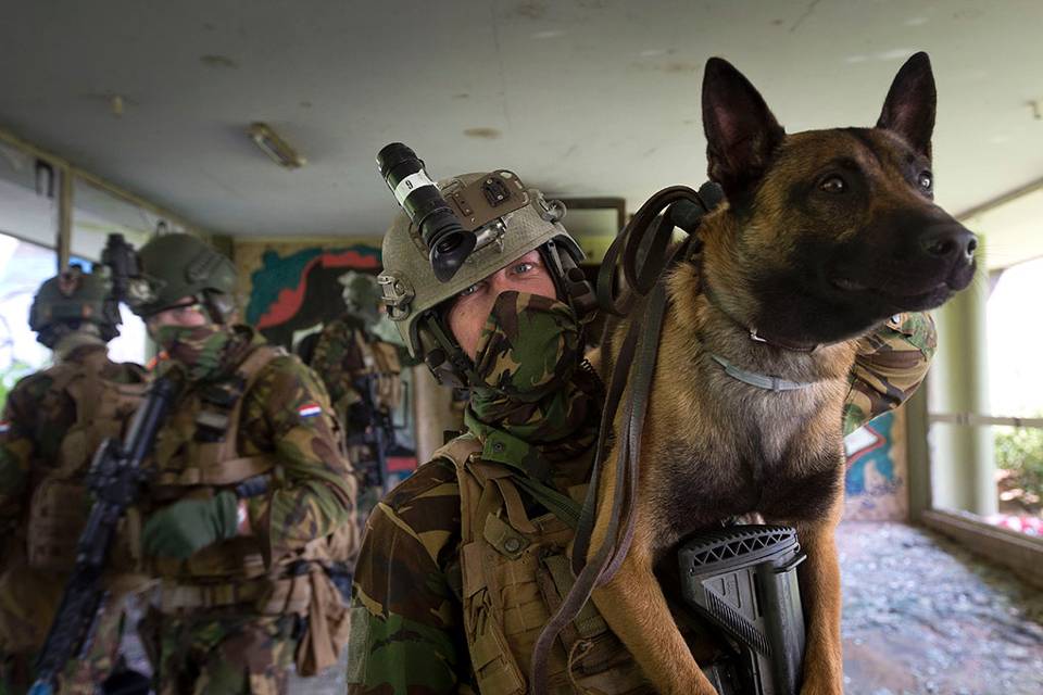 Het Korps Commandotroepen wordt bij een oefening door een Chinook afgezet bij een voormalig bejaardenhuis. De rest van de route leggen de mannen te voet af. Deze speciaal getrainde viervoeter heeft het beter voor elkaar. Hij wordt gedragen tot hij aan de bak moet om naar explosieven te snuffelen.