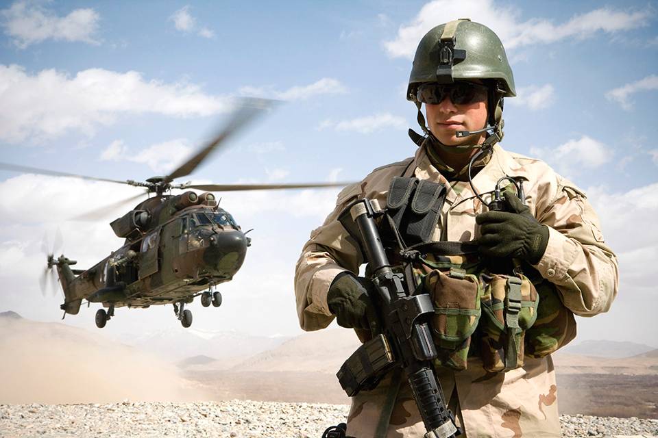 De krijgsmacht is wereldwijd inzetbaar. Een Cougar-helikopter landt op Forward Operating Base Mirwais in Afghanistan, ten westen van Kandahar. De landingsplaats van de wentelwiek wordt beveiligd door een Nederlandse militair.