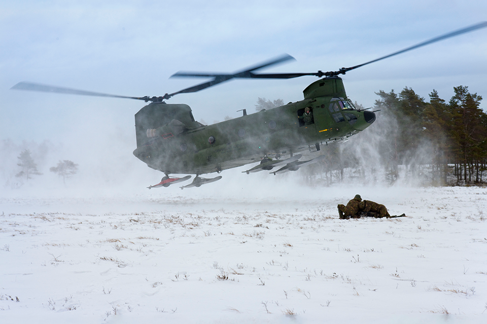 Vliegen door sneeuw levert een uitdaging op voor de bemanning van deze Chinook. Door het stuiven tijdens het landen ontstaat een white out en ziet de piloot niets meer. Tijdens de oefening Snowblaze bereidt de crew zich hierop voor.