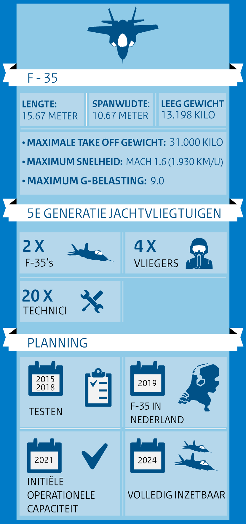 Het operationele testprogramma loopt nog tot en met 2018. Eind 2019 komen de eerste F-35’s over naar Nederland. Ze krijgen Leeuwarden als thuisbasis. Het aantal F-35’s op Nederlandse bodem groeit dan van jaar tot jaar. De F-16 faseert geleidelijk uit.