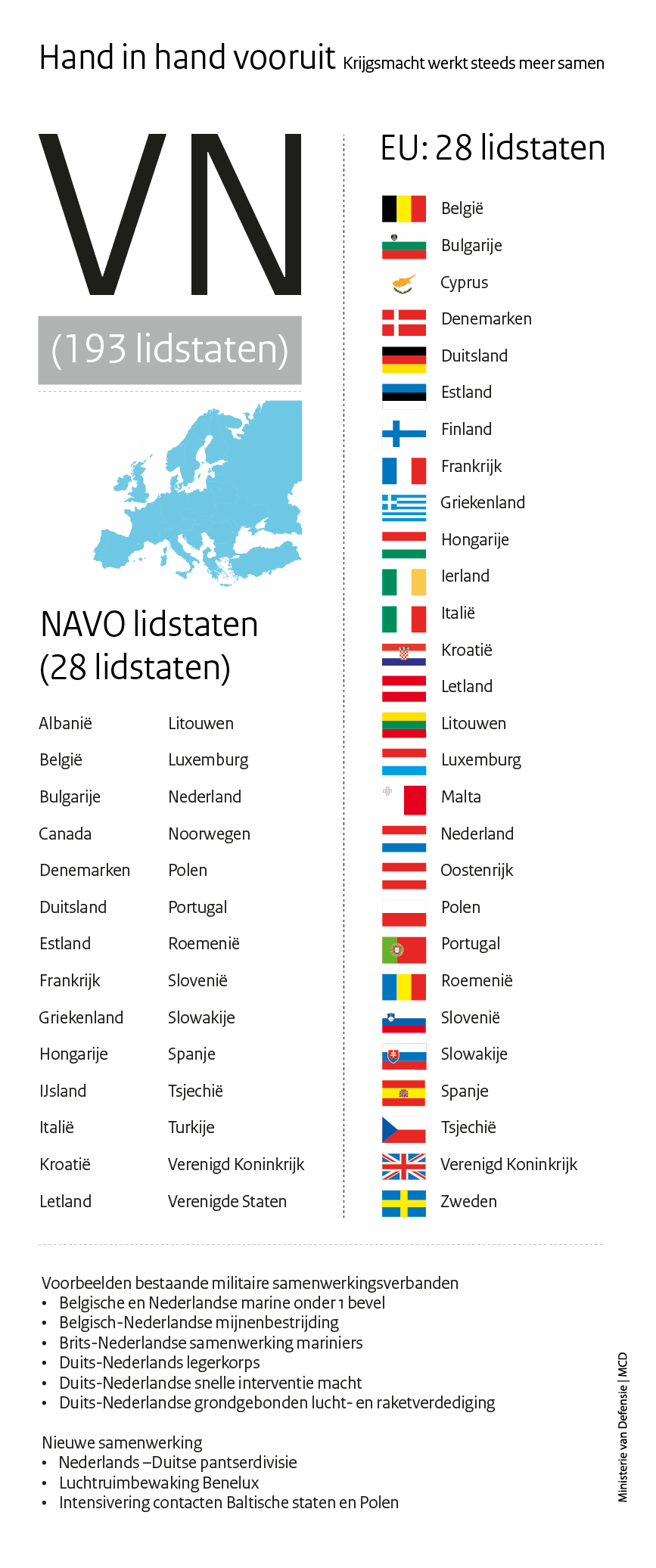Missies in conflictgebieden worden steeds vaker internationaal samengesteld. Ook dicht bij huis wordt de samenwerking gezocht. Zo is er het Duits-Nederlands Legerkorps, staan de Belgische en Nederlandse marine onder 1 bevel en werken de Britse en Nederlandse mariniers sinds jaar en dag samen.