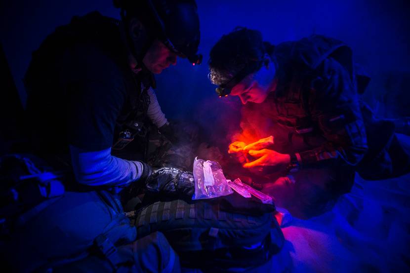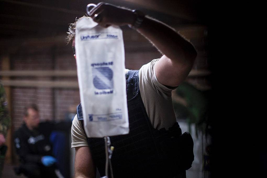 Tijdens de certificeringsweek worden realistische scenario’s nagebootst om de BSB-medics zo goed mogelijk op de proef te stellen. Voor het inbrengen van een infuus ligt er naast het ‘echte’ slachtoffer ook een pop waarin daadwerkelijk geprikt kan worden.