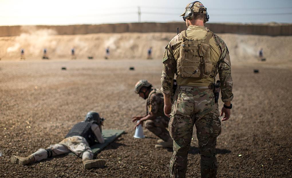 Op de schietbaan kijkt teamleider tweede luitenant Bas toe hoe een Iraakse instructeur de schietdag leidt. De commando’s blijven op gepaste afstand. Dat kan ook, want inmiddels zijn de trainers zo ver dat ze zelfstandig een les draaien.
