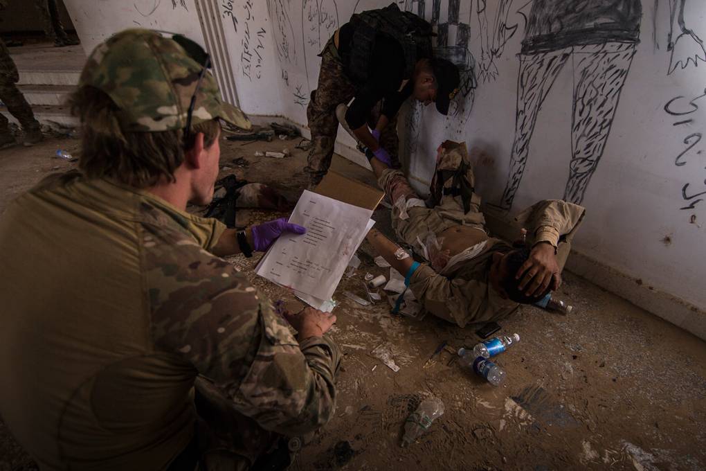 Het eindscenario van de medic-opleiding. De Irakezen moeten in de chaos van een mass casualty alle gewonden volgens Westerse protocollen behandelen. Verwondingen die zonder de medische opleiding dikwijls tot de dood leidden. “Ze hadden hiervoor nog nooit van een tourniquet gehoord. In het begin legden ze die al aan bij een schaafwond”, zegt korporaal Jimmy. “Nu niet meer, hoor. Het zijn snelle leerlingen en bovendien super gemotiveerd.”