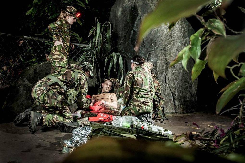 Slangenbeten, hittestuwing, nekkramp: om in een passende sfeer het onderkennen en bestrijden van tropische ziektes te beoefenen, bleven 18 genezeriken van de landmacht onlangs een nachtje over in Burgers Zoo. Temidden van breedsnuitkaaimannen, zeekoeien en aardvarkens moesten de mannen en vrouwen aan de bak met zogenaamd doodzieke patiënten. Bij een tropisch temperatuurtje van tegen de dertig graden en een luchtvochtigheid van 85 procent werd een zwaar beroep gedaan op hun skills en drills.