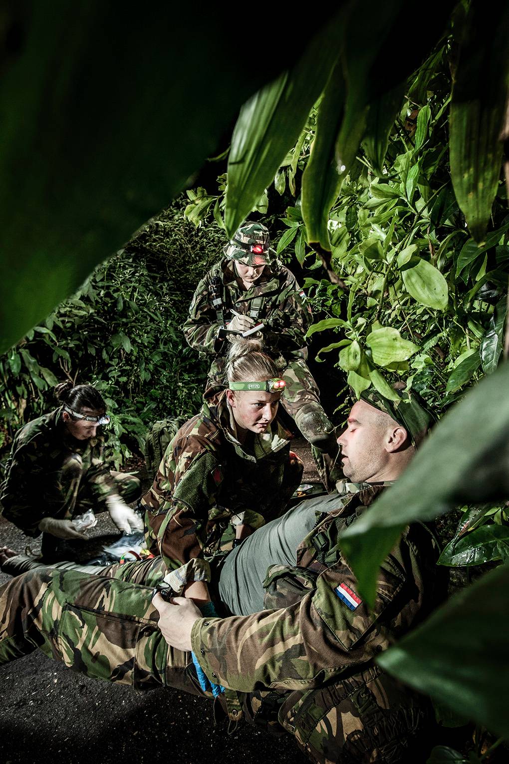De militair verpleegkundigen stuiten tijdens hun tropische patrouilles op meerdere medische casussen. Een slangenbeet, een slachtoffer met hittestuwing en een geval van nekkramp stellen de kennis en kunde van de mannen en vrouwen op de proef. “Ook al werk je soms half in de bosjes, je moet gewoon je medische protocol blijven volgen”, vertelt AMV’er Nieveen. “En tussen de bedrijven door zet je je veldfles aan de mond. Want je moet in deze omstandigheden echt blijven drinken.”