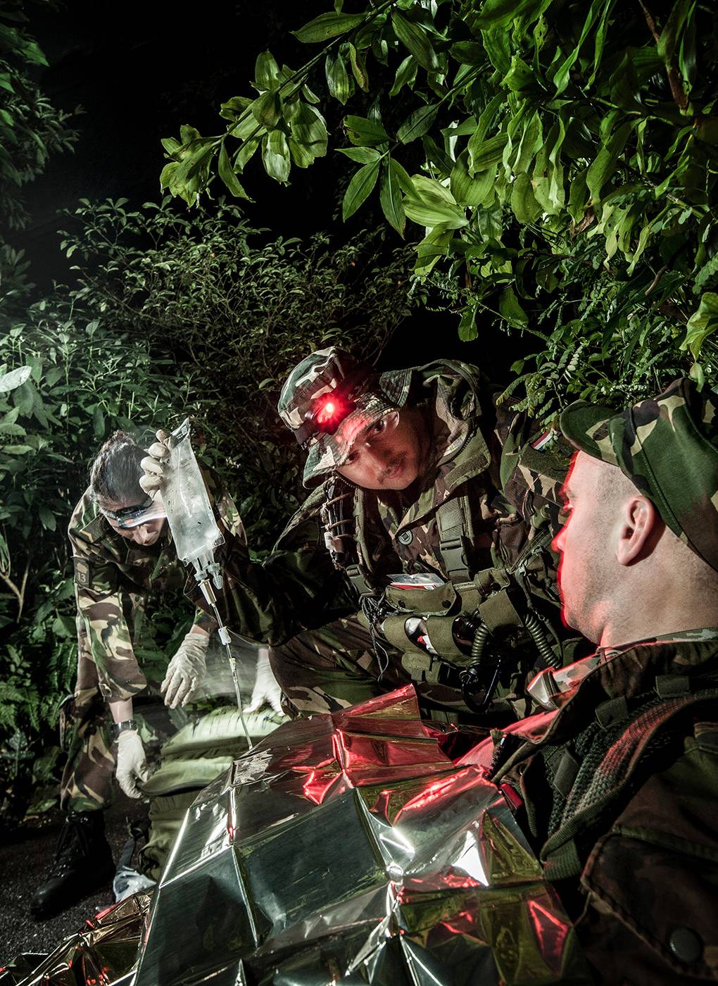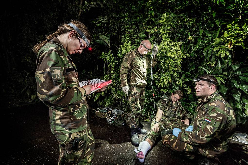 De nacht in de bush vormt het sluitstuk van 3 Afrikadagen van 13 Geneeskundige Compagnie. De medische eenheid uit Oirschot spijkert hiermee haar medische kennis en kunde over uitheemse kwalen en tropische ziekten en trauma’s bij. “Dit is nog eens wat anders dan de Oirschotse heide”, lacht sergeant-1 Gert Nieveen. “Door de warmte en het vocht zweet je al snel flink. Maar eenmaal bij het slachtoffer gaat de knop om en ben je weer helemaal gefocust.”