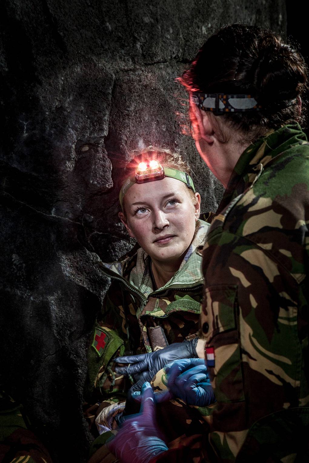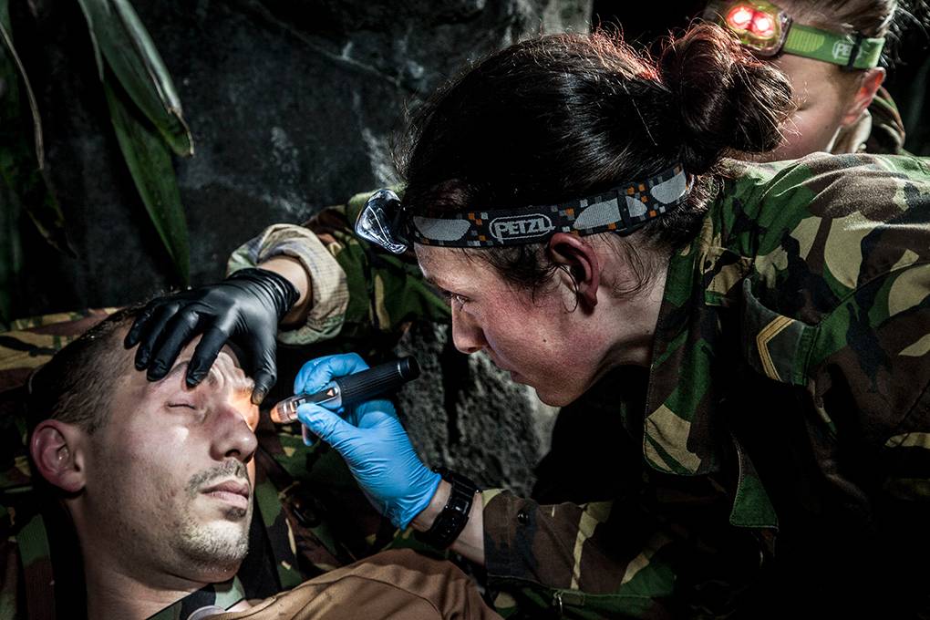 “Blijf erbij Erwin!” Hangende oogleden, wazige blik, open mond. Nauwgezet loopt sergeant-1 Melissa Kneppers de levenstekenen van haar patiënt na: luchtweg vrij, ademhaling, circulatie... KLING KLANK! Vragend kijkt ze om in de richting van het blikkerige geluid. “Ga door,” zegt kapitein Yvette van Leest. “Het zijn de aardvarkens maar.”
