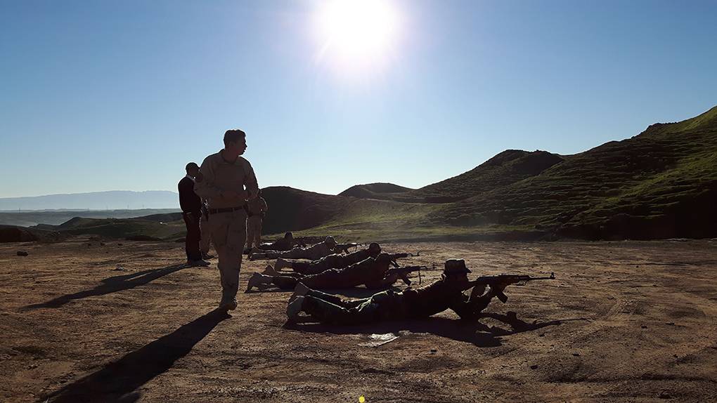 Liggend schieten is stabieler en veiliger dus wordt het de Peshmerga aangeleerd.